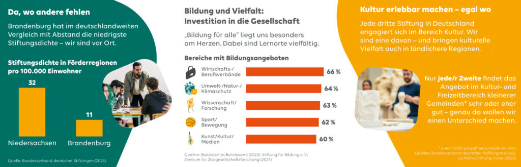 Ob Bildungszugang, Umwelt- und Naturwissenschaften oder kulturelle Vielfalt in ländlichen Regionen: Die EWE Stiftung stärkt das Miteinander, indem sie jungen Menschen Chancen eröffnet und kulturelle Gemeinschaftserlebnisse ermöglicht. So wird der Tag der Stiftungen auch zum Anlass, den Blick nach vorn zu richten: Mutig gemeinsam handeln für eine starke, offene und solidarische Gesellschaft.
